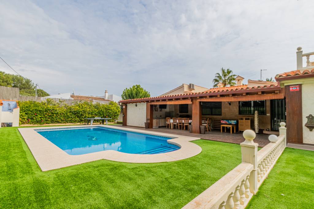 Espectacular villa independiente, distribuida en una sola planta, en Albir. A tan solo 8-10 minutos a pie del centro de Albir. Se puede disfrutar de un gran jardín con distintos tipos de arboles frutales, cocina de verano / barbacoa, piscina privada y zona de aparcamiento cubierta. La vivienda está distribuida en un amplio hall de entrada, salón-comedor con chimenea, cocina independiente, 4 dormitorios (3 de ellos con su propio baño y 1 con vestidor), 3 cuartos de baño y 1 aseo. Calefacción central en todas las estancias mediante radiadores (deposito de gas) y 4 aparatos de A/A (tipo split). Recientemente reformada y en perfecto estado para vivir.